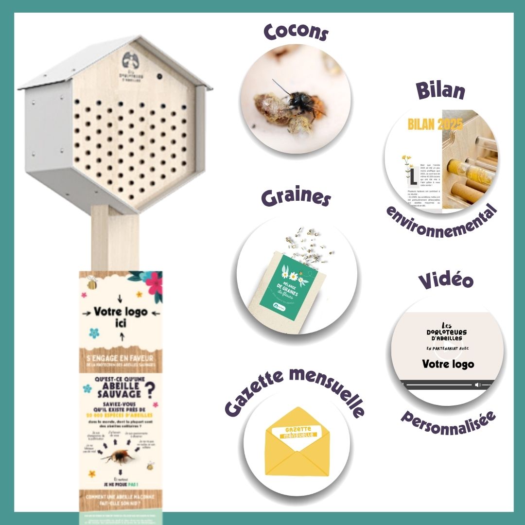 Cet abri à abeilles solitaires offrira un abri aux abeilles sauvages. Ces petites butineuses ne vivent pas en colonie, ne fabriquent pas de miel et ne piquent pas. Les tubes d’observation transparents permettent une observation des abeilles sauvages tout au long de leur cycle. Le panneau présente les abeilles sauvages qui peuvent s’installer dans le Dorlotoir, comment les observer, comment elles font leur nid, etc. Fixez-le directement sur le pied du Dorlotoir ! Vous pouvez personnaliser votre panneau avec votre logo.